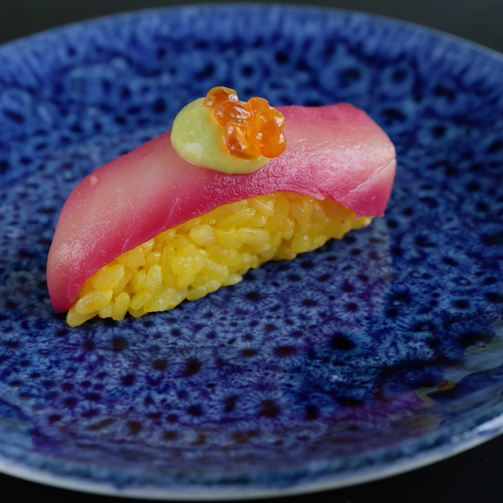 Morbido riso allo zafferano guarnito con Pesce spada marinato con rapa rossa, arancia, lime e maracuja. Top di salsa guacamole e uova di salmone.Â