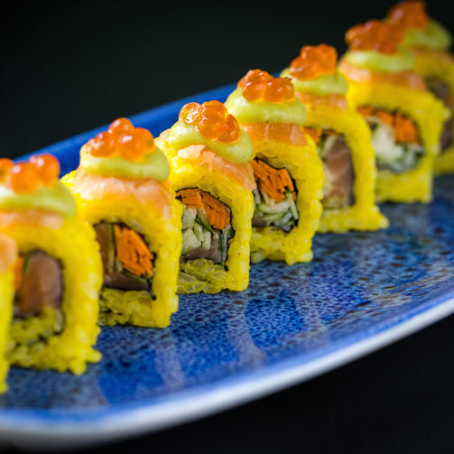 Rolos con riso allo zafferano con filetto di salmone all' interno, cetriolo e carote. Top di salmone, guacamole e uova di salmone.Â