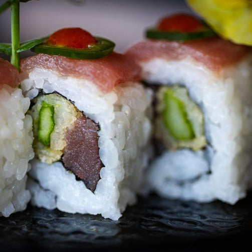 Filetto di tonno e asparago in tempura avvolto nel riso, accompagnato da filetto di tonno e jalepeno e salsa siracha.