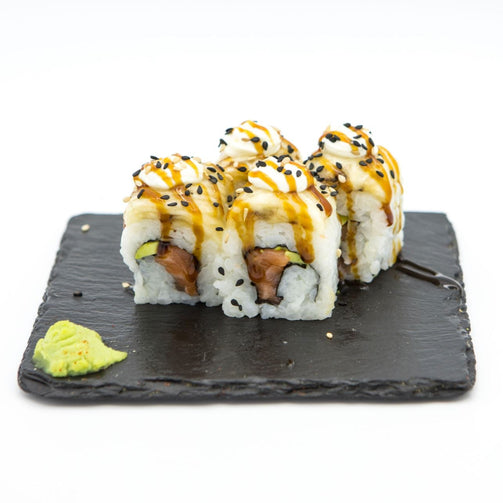 Rolos che ti conquisteranno con il loro inedito mix di sapori: riso, filetto di salmone, alga nori, avocado, banana, formaggio fresco spalmabile e salsa teriyaki.