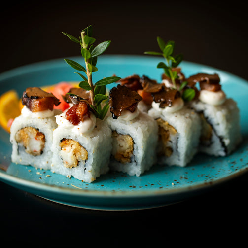 Gambero in tempura all'interno, mayonese al pepe nero, guanciale, scaglie di tartufo nero.