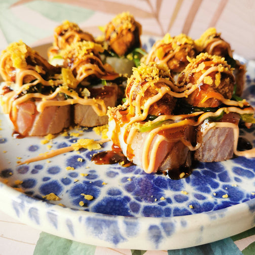 Filetto di tonno all'interno accompagnato nella parte superiore da tonno falmbè, punta di mayo, goma wakame, polpettina di tonno in tempura all'anice, salsa Rolinho, teriyaki e farina nachos.