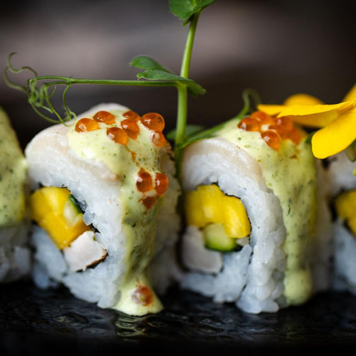 Filetto di pesce spada flambè, mango, cetriolo, spada flmabè e top di mayo al basilico e uova di salmone.