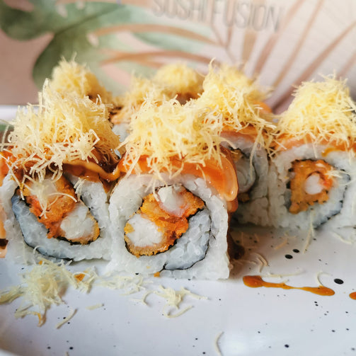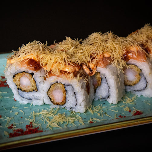 Gambero in tempura, filetto di salmone flambè, kataifi, salsa rolinho, teriyaki.
