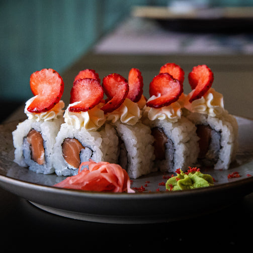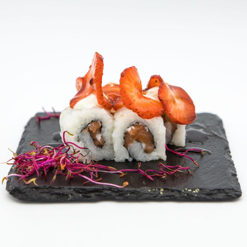 Lasciati sedurre dal sapore unico della fragola e del suo sciroppo, che in questi rolos accompagnano riso, filetto di salmone, formaggio fresco spalmabile e alga nori.