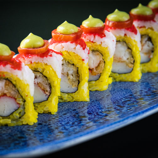rolos croccante con gambero in tempura e surimi all'interno e top di surimi pomodorino rosso e guacamole.Â