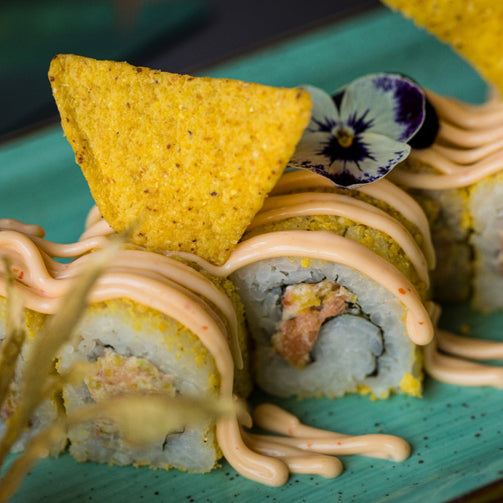 Il peperoncino jalapeño è l'asso nella manica di questi gustosi rolos con riso, alga nori, tartare di salmone, formaggio fresco spalmabile, nachos e salsa rolinho.