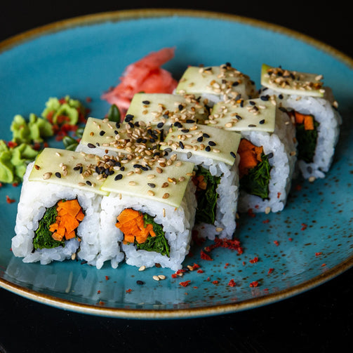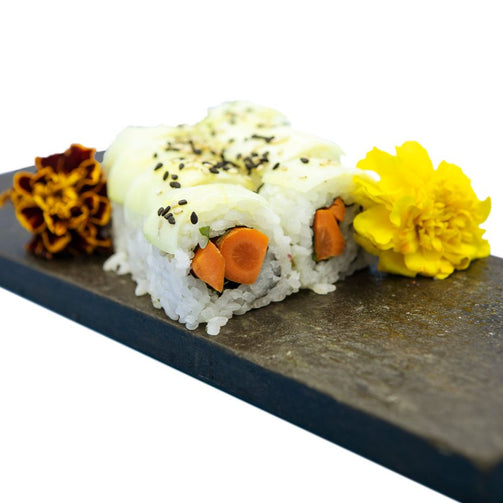 Gustosi rolos vegetariani, da provare assolutamente. Riso e alga nori, tempestati di sesamo, abbracciano un cuore fatto di rucola, carota e zucchina.