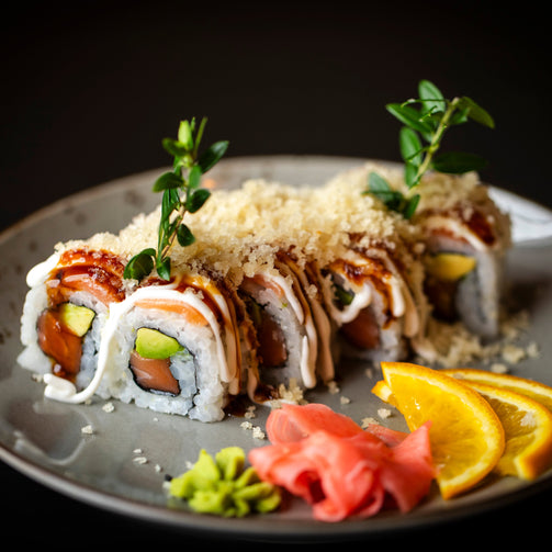 Filetto di salmone, filettino di avocado, filetto di salmone scottato, scaglie di Panko, mayo, teriyaki.