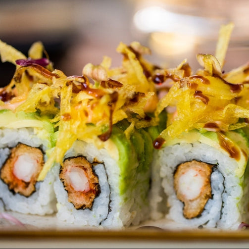 Gambero in tempura, avocado, patate croccanti, salsa Rolinho, teriyaki.