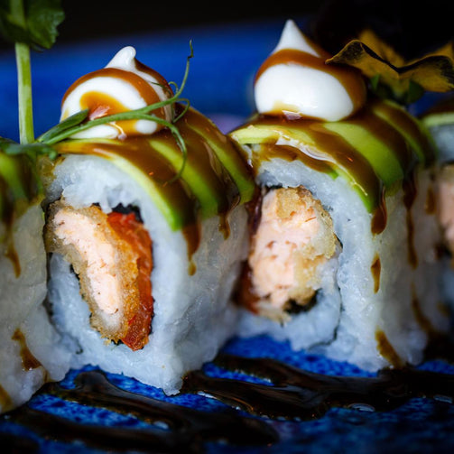 Salmone in tempura e peperoni avvolti nel riso, decorati con slide di avocado mayo e teriyaki.