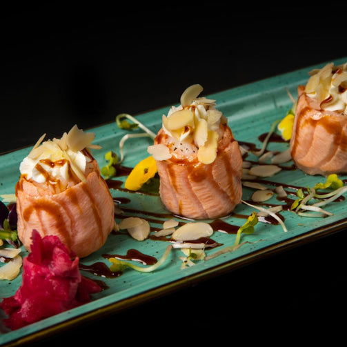 filetto di salmone flambè, formaggio fresco spalmabile, teriyaki, scaglie di mandorle.