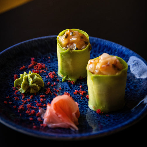 Filetto di avocado con tartare di gambero, salsa mango habanero con top di passion fruit.