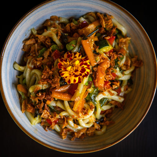 Noodles con zucchine, carote, peperoni, edamame, goma wakame, cipolla croccante, salsa di soia e marmellata mango e habanero.