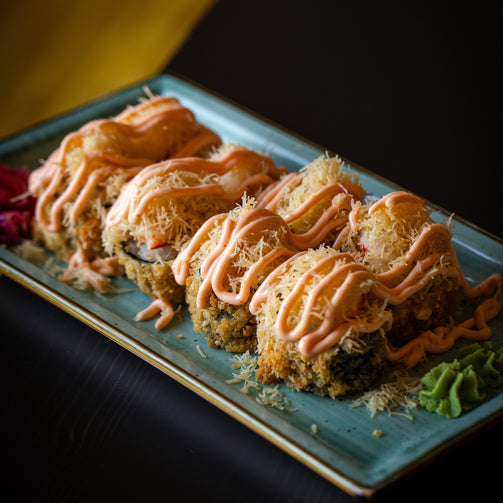 Prelibatezza by Rolinho. Un mix di gusto: riso, alga nori, panko, avocado, formaggio fresco spalmabile, tartare di gambero, pasta kataifi e salsa Rolinho. Imperdibile!