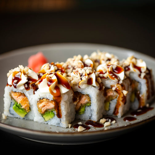 Morbidezza e croccantezza in un morso. Salmone tempura abbinato a cremoso formaggio fresco spalmabile. Un'accoppiata impreziosita da avocado, mandorle e salsa teriyaki.