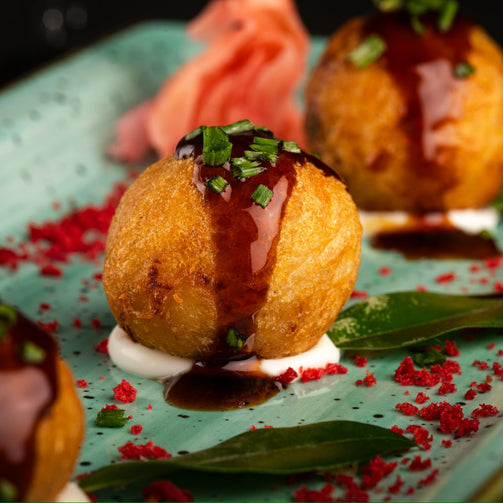 Polpettine ripiene di polpo su base maionese , goccia di teriaky e erba cipollina